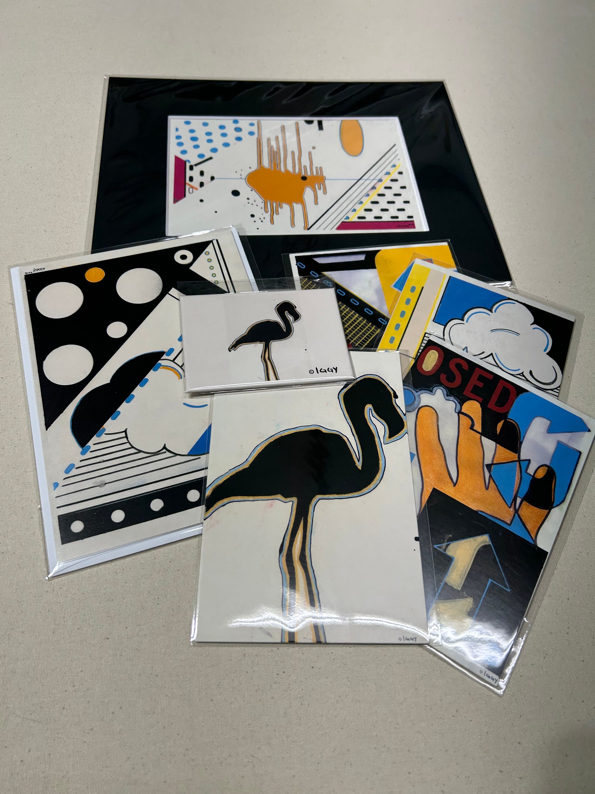 Orange Drip 5x7 painting in 8x10 mat board, 5x7 greeting card, 4 postcards, flamingo magnet